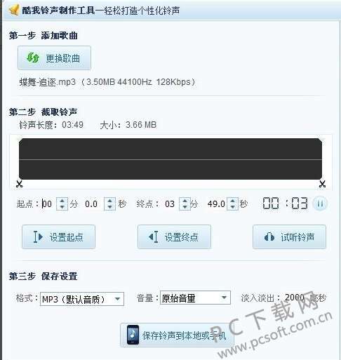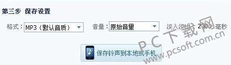 7、将音乐剪切完成后就来到最后一步,如下图所示,将剪切好的文件设置好格式、音量,然后点击下方的保存铃声到本地或手机,弹出保存位置选项,选择好保存位置后耐心等待保存成功就可以了。
