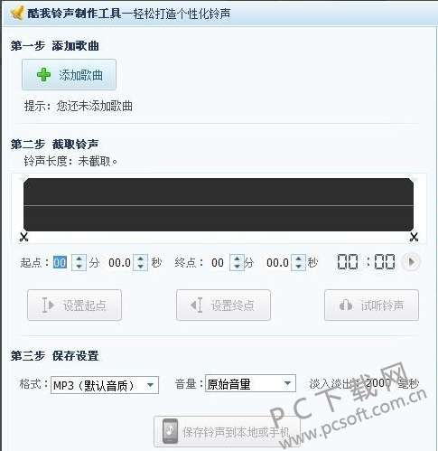 4、下图就是打开“铃声制作”的界面,首先我们需要先添加歌曲,然后才能开始对歌曲进行剪辑,所以第一步点击添加歌曲选项,然后在弹出的电脑文件夹中选择歌曲所在的位置,将歌曲导入进来,完成后我们就可以开始剪切歌曲了。