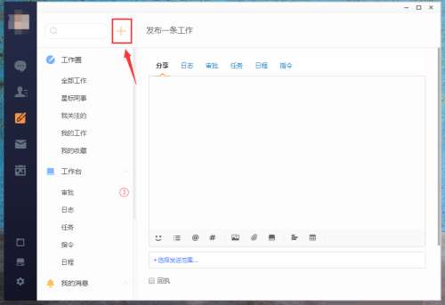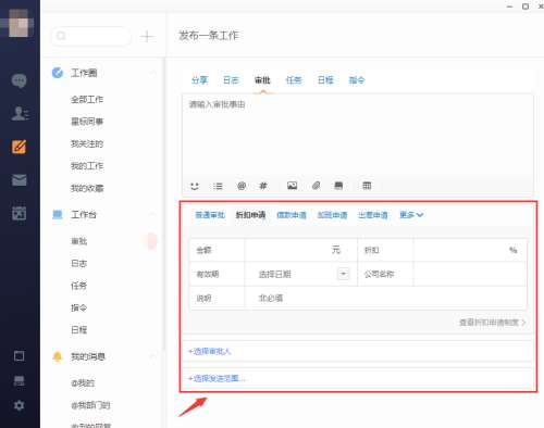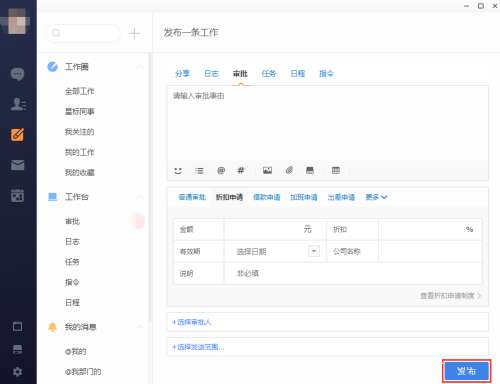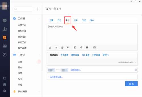 下一步可以看到可发布的类目,包括:分享、日志、审批、任务、日程和指令,我们点击“审批”;