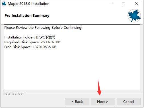 1、解压缩在PC下载网下载的软件包,双击“Maple2018.0WindowsX86Installer.exe”程序进入欢迎安装界面,点击【Next>】继续