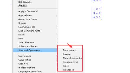 右击矩阵,选择标准操作,里面有矩阵的运算,例如选择第一个determinant转换为行列式计算