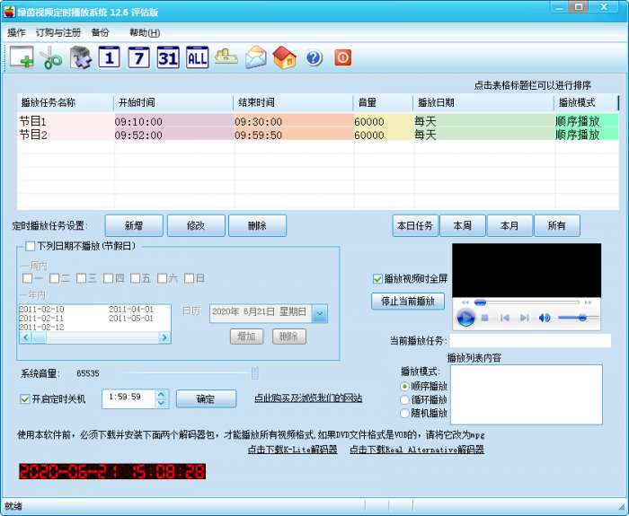 1、定时播放功能---系统可按企业、学校、机关、电视台等设置的时间表通过本软件定时播放各类视频或广告。