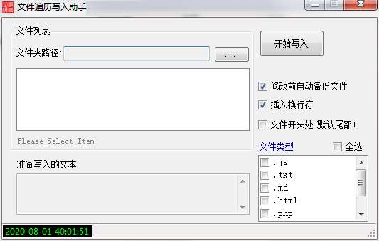 文件夹遍历写入助手官方版是一款简便易用的文件管理工具。文件夹遍历写入助手最新版体积非常小才39KB,支持选定目标文件夹,将指定类型的文件指定位置加入自定义的文本,相信有不少的作用。文件夹遍历写入助手官方版默认自动备份和插入换行符,还有详细日志记录。