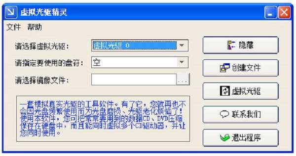 虚拟光驱精灵中文版是一款十分出色的模拟真实光驱软件,虚拟光驱精灵官方版可把常常要用到的数据CD、DVD压缩保存在硬盘中,而且能同时虚拟多个CD驱动器,并让您同时使用,虚拟光驱精灵中文版能满足用户在玩游戏或各种应用中对数据传输速度的最苛刻要求。