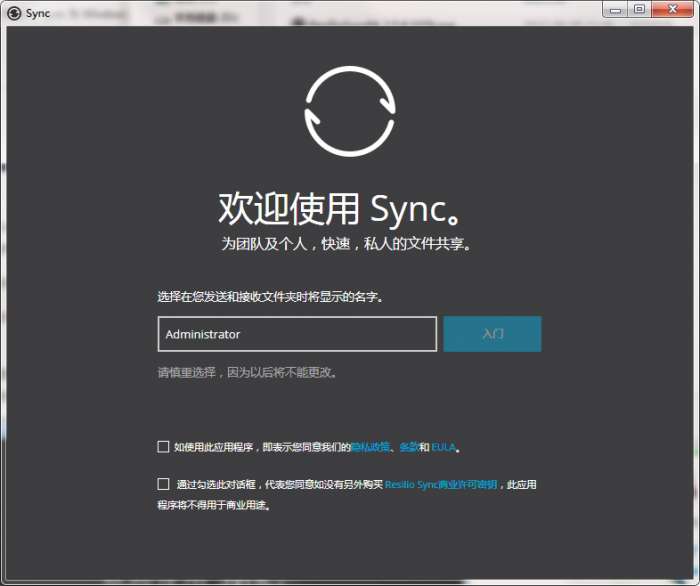 通过勾选此对话框,代表您同意如没有另外购买 Resilio Sync商业许可密钥,此应用程序将不得用于商业用途。