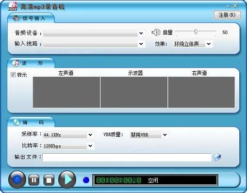 嘉音高清MP3录音机是一款功能强大的MP3录音编码软件。支持32KHz、44.1KHz和48KHz采样率,实现从32Kbps到256Kbps比特率压缩编码,支持VBR/CBR编码,能够轻松实现从语音音质到高清数字音频音质的录音编码。支持PC和大部分主流中高档声卡,支持麦克、CD、线路、数码输入线路选择。