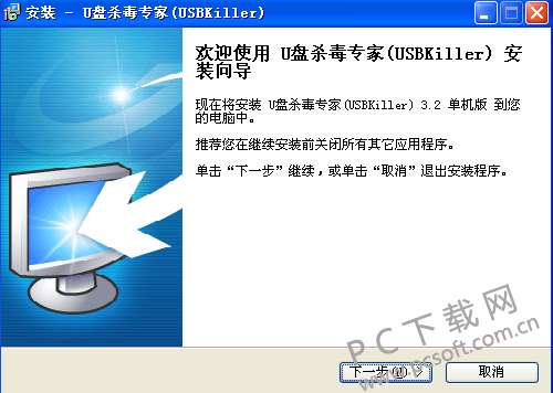 1、在PK下载网将U盘杀毒专家下载下来,并解压到当前文件夹中,点击其中的upanshaduzhuanjia_danjiban_3.21.1426562059.exe应用程序,进入安装向导界面,接着点击下一步。