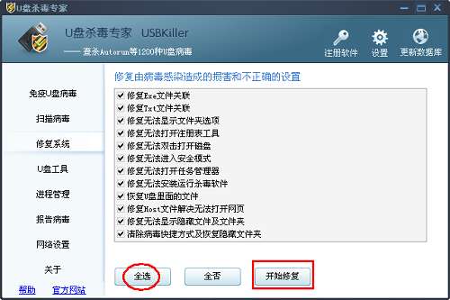 4、打开主界面后,在左侧单击修复系统,选择“全选”,点击“开始修复”就可以使文件或数据恢复到原有的设置了。可以修复“无法显示隐藏文件或文件夹”、“双击不能打开磁盘”和“U盘无法运行杀毒软件”等情况。