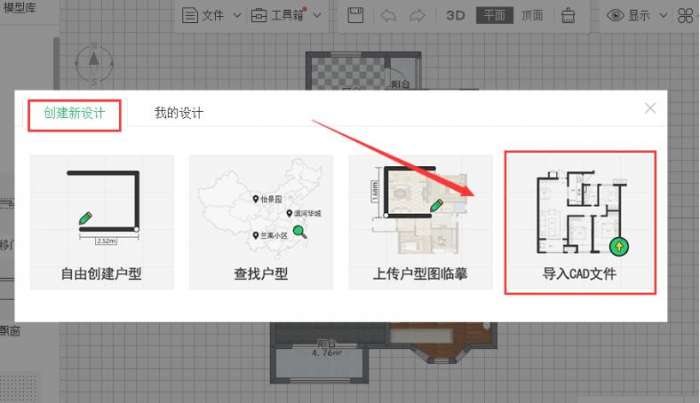 在设计页面上方点击【文件】-【新建设计】-【导入CAD文件】即可。