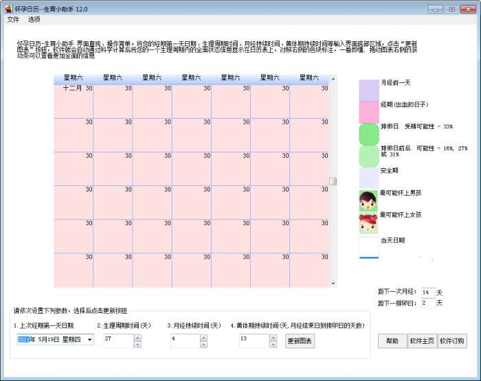 根据提示设置经期第一天日期、生理周期时间、月经持续时间、黄体期持续时间等参数,点”更新”按钮,软件将显示您一个生理周期内全面的状态信息。