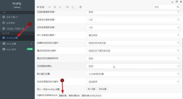 如果安装后不能正常使用,请重置一下AriaNG的设置,依次点击下图中的1和2,然后在弹出的对话框中确认重置即可!
