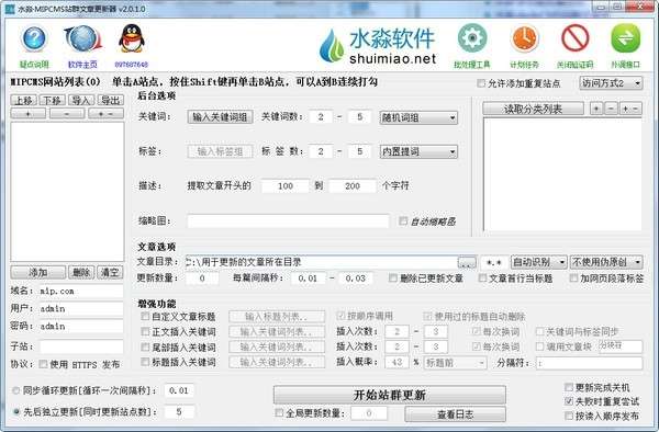 水淼软件出品的一款专门给MIPCMS站群批量更新文章的软件,可以帮助用户将一批文章自动发布到MIPCMS的文章分类下,可以有效提升站群文章更新的效率。