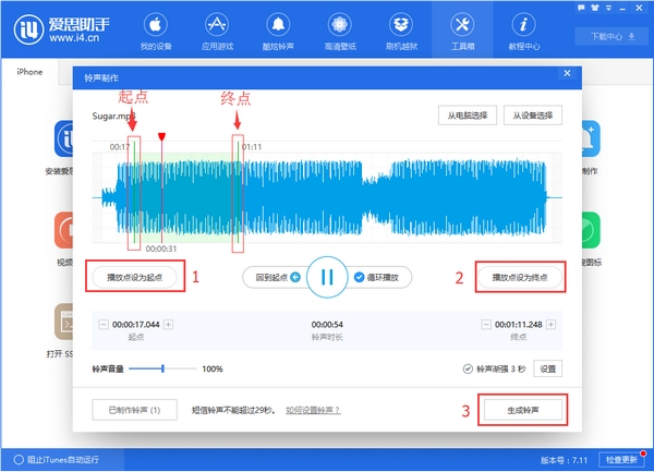 三、在试听时点“播放点设为起点”和“播放点设为终点”或 拖动起点和终点来确定铃声的区间,之后点击“生成铃声”来制作铃声;
