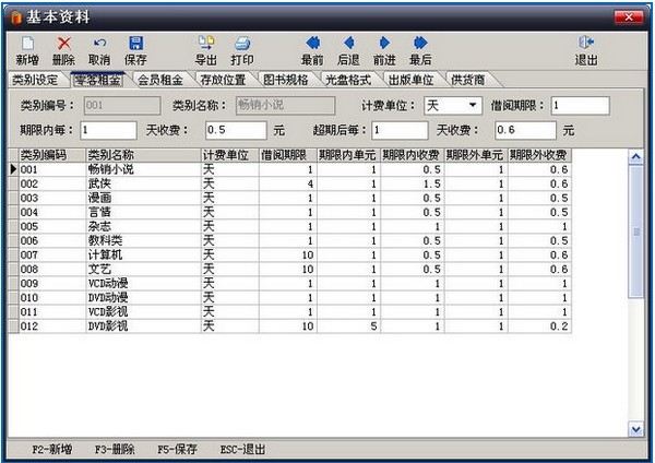 主菜单“基本资料”下的各个菜单项,实现本系统中基本资料的管理,包括类别设置、默认租金收费标准设置、存放位置设置、图书规格、光盘格式、出版单位和供 货商设置。这些功能集中在同一个窗口里实现,每个功能有一个选项卡,通过点击上面的标签来打开相应的界面。窗口上面的最前、后退、前进、最后可以移动当前 记录的指针。现将基本资料管理功能分述如下: