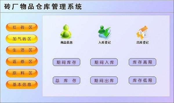 《砖厂物品仓库管理系统》是一款适用于砖厂物品仓库所开发的系统,该系统有红砖、加气砖,生活区、返修区、维修登记、原料区各模块中的入库 出库、库存、查询废等功能是一款有效的管理软件.