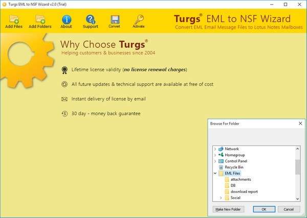 Turgs EML to NSF Wizard(EML到NSF转换工具)是一款非常不错的EML到NSF转换软件,这款软件可以批量转换EML到NSF和导入EML到Lotus Notes,并且在整个转换过程中保留电子邮件属性和格式结构。