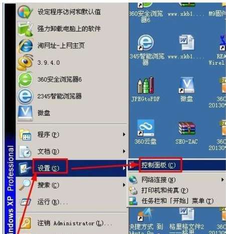 3、之后我们点开屏幕左下角的开始菜单,将鼠标光标悬停在“设置”一栏上,再点击打开“控制面板”;