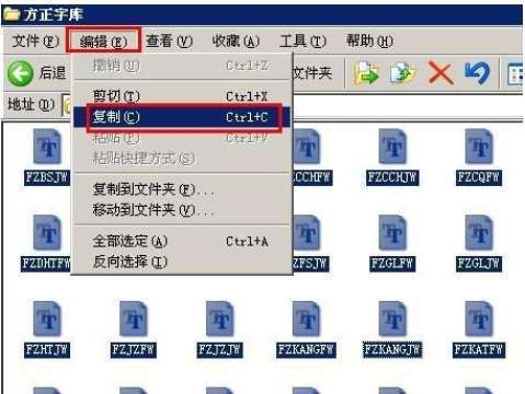 2、之后将这些字体文件全部选中,点击顶部菜单栏中的“编辑”按钮,然后点击下拉菜单中的“复制”功能,或者直接使用快捷键“Ctrl+C”来进行复制;