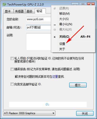 使用gpu-z显卡检测软件可以很快速的进行显卡体质测试,我们在软件上方的标题栏右键单击然后可以选择设置