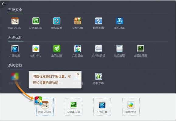 2)使用“功能大全”按钮取代之前的“自定义扫描”按钮,让您更方便地找到各种功能。右下角的快捷工具数量增加到4个,让您能够更加自由地定义快捷功能。