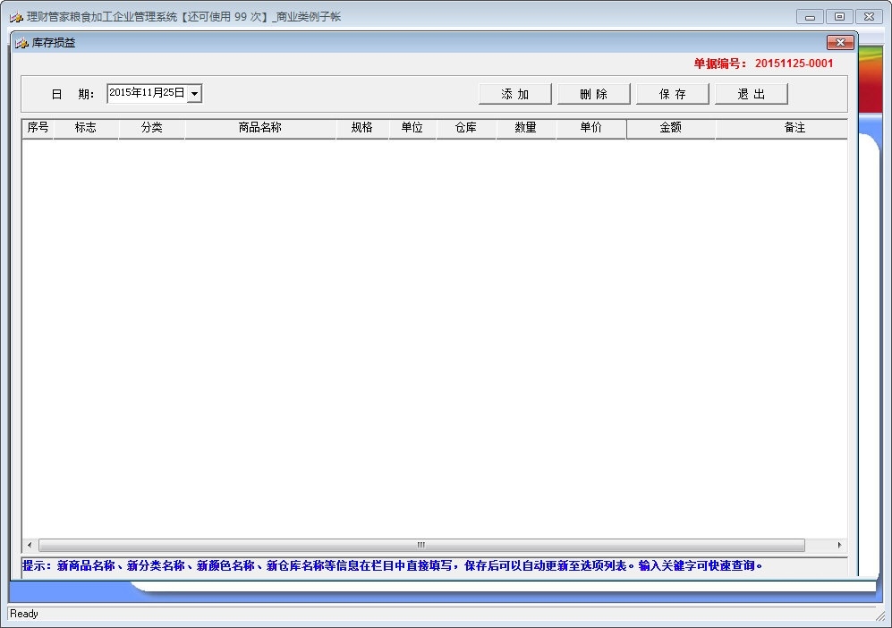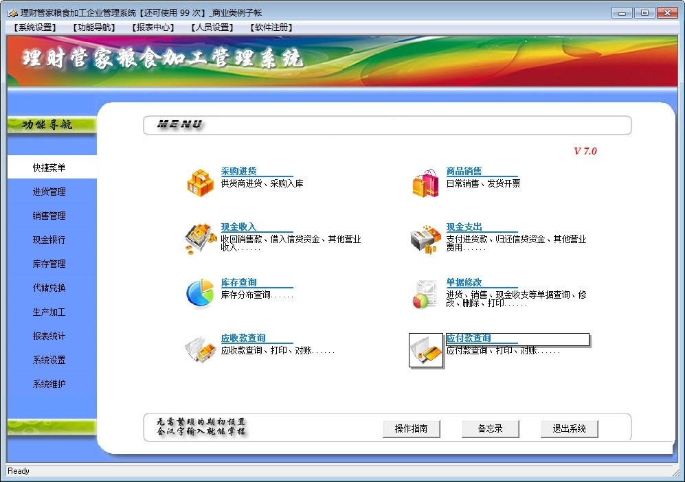 理财管家粮食加工企业管理软件官方版采用“简单易用”的理念设计,上手快,能及时准确地帮助您了解企业每天的销售收入、费用支出、往来帐款、粮食代储、粮食收购加工及粮食代储兑换业务、财务数据,全面辅助企业经营管理;能让您随时了解企业的业务数据,清晰地了解每一件商品、每一笔资金、每一项欠款、每一项费用以及盈亏的来龙去脉,让您明明白白做生意。