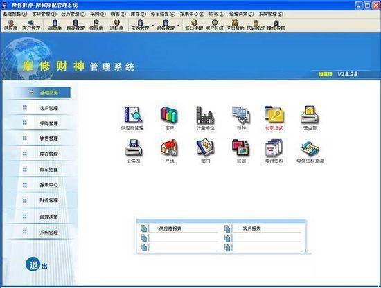 摩修财神摩修摩配软件可广泛使用于各种规模的摩修企业。目前该系统已在全国近3000家从事摩托车修理、摩配销售的单位得到推广使用,颇受好评。