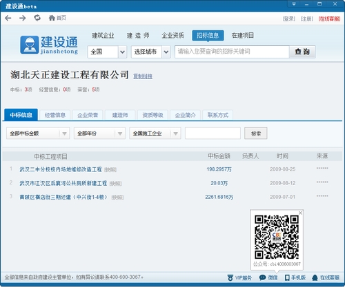2、包含建筑行业的中标、荣誉、资质、诚信档案、联系方式等信息。