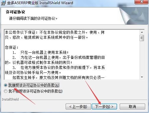 1、在PC下载网下载金多A5ERP商业版压缩包,然后进行解压,解压后,双击exe程序,进入安装界面,然后点击下一步