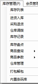 5.库存管理包括库存列表、进货入库、采购退货、库存记录、商品查询、仓库管理等选项,如图: