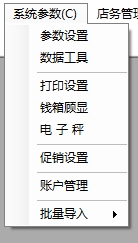 9.系统参数包括参数设置、数据工具、打印设置、促销设置等选项,如图: