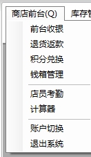 4.商店前台包括前台收银、退货返款、积分兑换、钱箱管理等选项,如图: