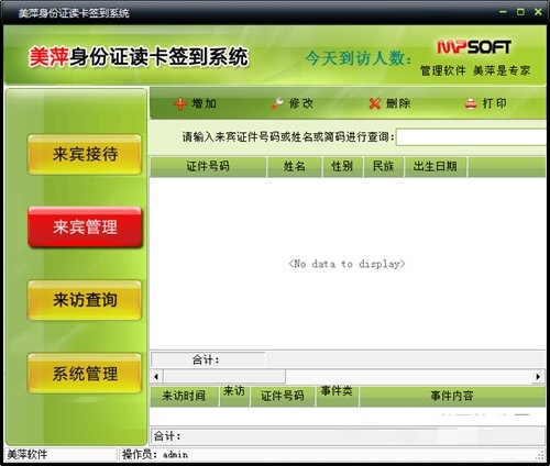 美萍身份证读卡签到系统最新版是款设计非常出色且又操作简单的身份证读卡签到管理工具,美萍身份证读卡签到系统最新版内置丰富的功能,其软件可以将宾客的身份证进行识别记录管理,美萍身份证读卡签到系统提供来访事件记录,来宾信息查询、来访信息查询统计等功能。