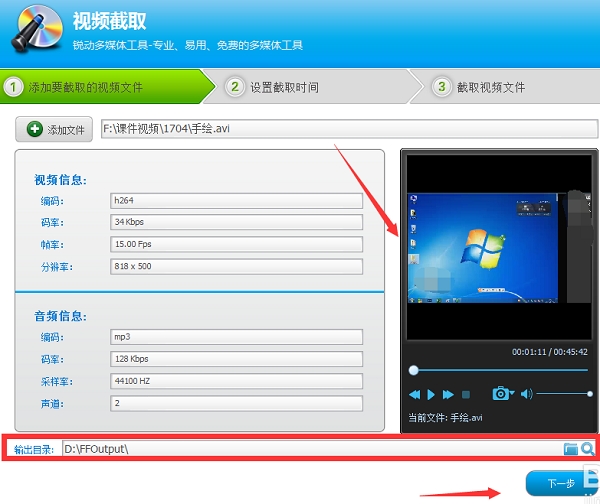 3、将视频插入之后,在右侧位置展示视频信息,点击下面的输出目录位置,选择一个导出视频的路径,点击下一步
