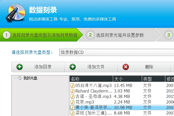 2、在数据刻录里面添加音乐文件
