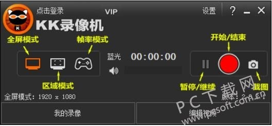 1、双击打开kk录像机,打开软件后,进入软件主界面。KK录像机针对不同的录制对象分为3种录制模式,开始录制前必须选择合适的录制模式。