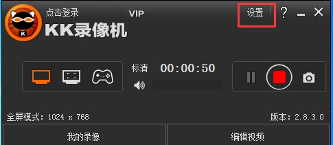 1、打开kk录像机,打开软件后点击右上角的【设置】。