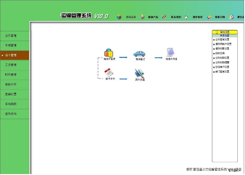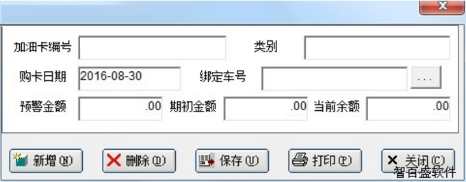 2、加油卡管理:对加油卡进行管理。包括办理加油卡、设置预警金额、记录当前余额等。