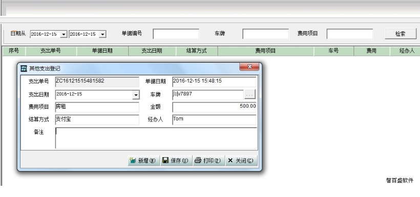 10、支出登记功能,在软件可以为其他支出内容登记,可以输入支出单号、支出日期、费用项目、结算方式、备注