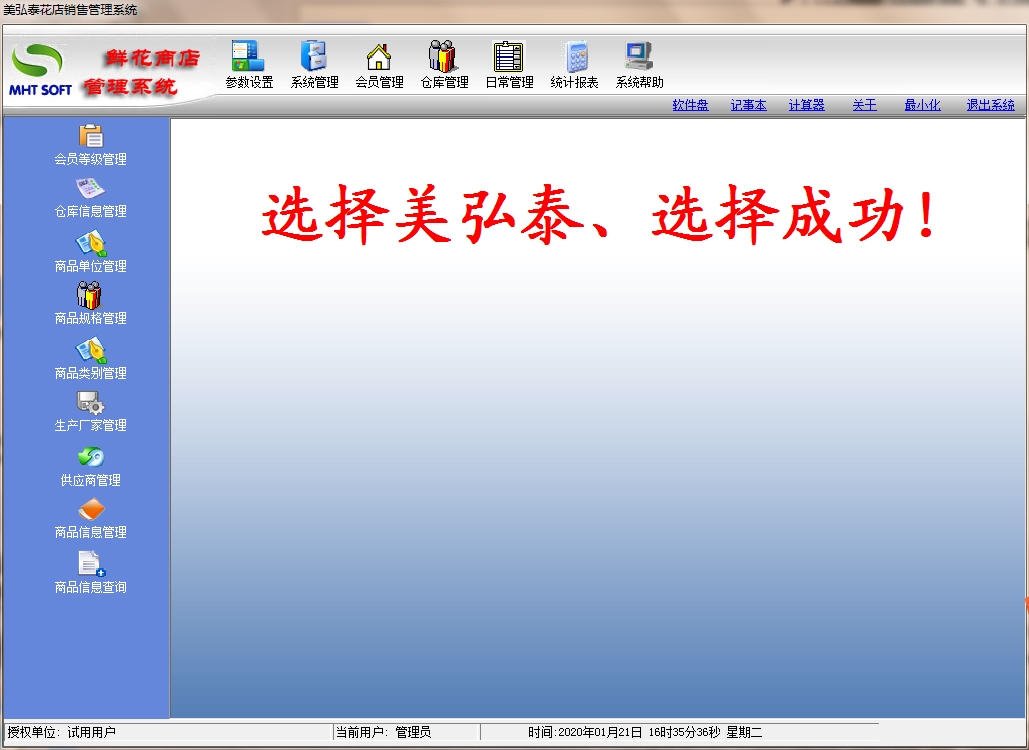 美弘泰花店销售管理系统最新版是一款非常适合花店使用的鲜花销售管理软件,美弘泰花店销售管理系统最新版界面简洁,功能强大,能够轻松快捷的对花店进行管理,不仅如此,美弘泰花店销售管理系统官方版还支持会员积分、会员开卡、会员信息查询、会员充值、会员转账等操作。