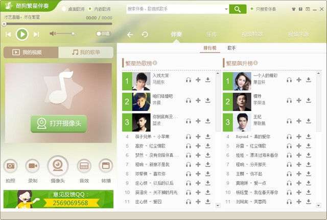 酷狗繁星伴奏是酷狗繁星出品的K歌伴奏软件,针对目前中国音乐产业面临转型,演艺市场的兴起以及线上数字音乐市场的逐渐成熟,为顺应新的产业环境和结构,繁星网应运而生。有海量的原版伴奏,没有您找不到的伴奏,有虚拟视频美化功能,美化滤镜、可爱饰件、瘦脸塑身等,在摄像头前绽放你的美丽。