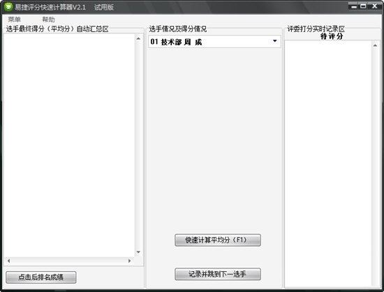 软件运行后,请在“评委打分”实时记录区,逐一录入评委的打分,录入一个后按回车到下一行,录入下一个评委的打分。所有评委对一个参赛选手打分完毕后,按F1(或点击“快速计算平均分”)软件会自动计算出最高分、最低分并去除后计算参赛选手的平均分。录入、计算简单快速,并常规方法能节约不少时间。