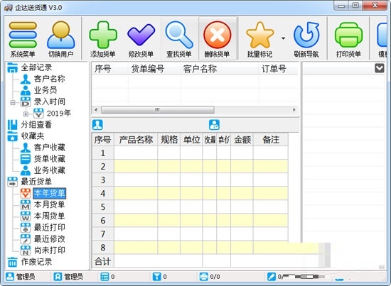 企达送货通中文版是款用途十分广泛且功能十分强劲的送货单管理工具,企达送货通中文版采用直观的操作界面,其软件主要集送货单打印、编辑、统计和分析于一身,企达送货通采用独立的数据库系统,配合四级权限分配,还可以生成详细的统计图表和对账单,可以帮助您更加方便地工作。
