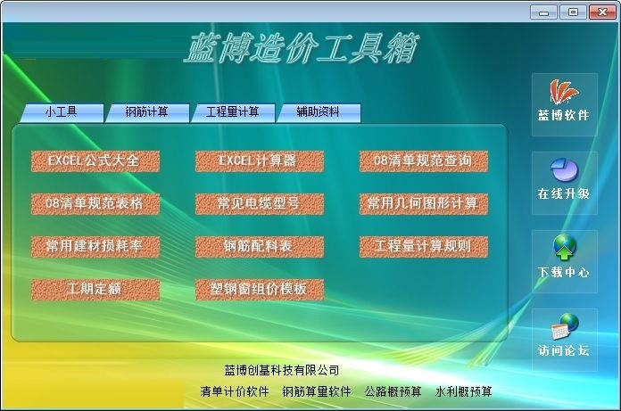 蓝博造价工具箱官方版是款针对工程建筑行业所打造的预算造价工具。蓝博造价工具箱电脑版可以帮助用户进行人工费的计算,材料费用的计算,并且用户的界面是相当的友好,可以灵活的完成各种功能的操作。蓝博造价工具箱还拥有计算数据准确以及组价灵活的特点,包含了工程计算、钢筋计算、工程量计算以及辅助资料等模块,主要适用于各类建筑、安装、市政、园林等设计领域。