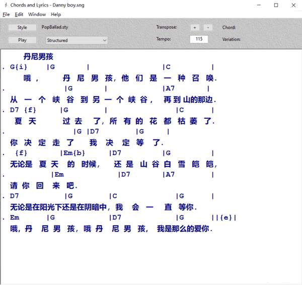 2、按照软件的识别要求,如下列方式打入歌词跟和弦,软件会自动帮你生成伴奏的MIDI音乐,可以将MIDI音乐在其他软件上进行专业的音色替换,让你的伴奏品质进行升级。