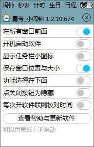 2、勇芳小闹钟官方版可设置窗口最前、开机启动、保存窗口、功能位置等在内的选项。