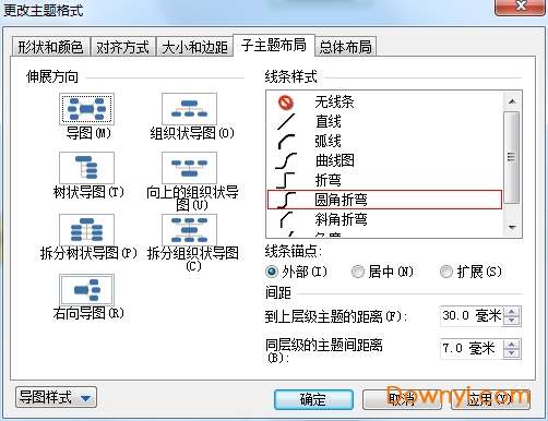5、格式修改(二):mindmanager也有很多设置可以在“更改主题格式”对话框中完成,选中主题,右击选择“格式化主题”即可打开。这里你可以修改导图结构(方向),也可以修改线条样式,小编比较偏爱于线条渐细的效果,这个在“总体布局”里设置就好,其他的,你们自己尝试看看效果吧。