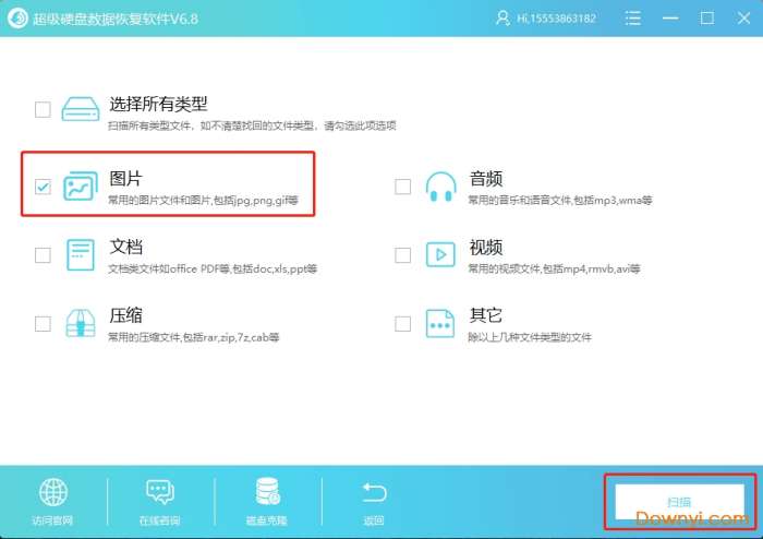 选择需要扫描恢复的文件类型,这里我们既然要进行删除的图片恢复,那我们就将超级硬盘数据恢复软件的扫描类型设置为图片文件,然后进行扫描;