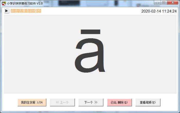 小学识字拼音练习软件电脑版是款适合于学生们使用的汉字拼音学习公寓。小学识字拼音练习软件正式版可以添加生字库,熟练掌握的可以删除,剩下的都是疑难的,慢慢的逐步掌握。小学识字拼音练习软件还可以设置时间间隔随机播放文字,根据熟练程度调整间隔的秒数。生字库内含了自动添加韵母声母这些,非常方便。也可以家长输入需要学习的汉字。