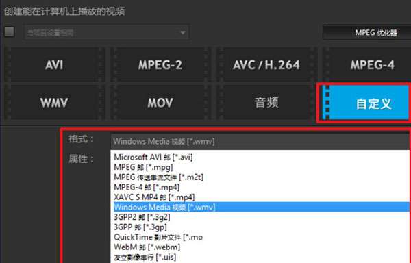 4)如果这几个格式没有你想要的,例如mp4,可以点击自定义,再选择格式