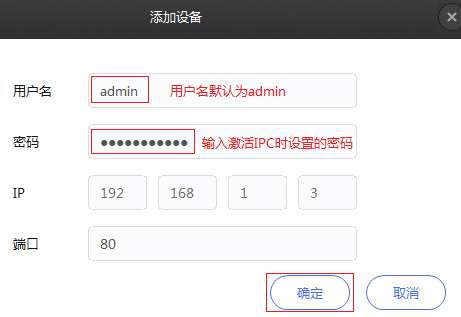 待添加设备 中,点击 添加,输入IPC的用户名及密码。用户名出厂默认为admin,密码为激活设备时设定的密码。并点击 确定,如下图。